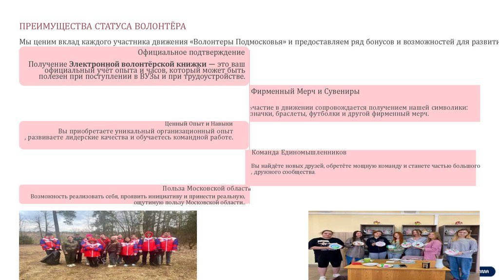 ПРЕИМУЩЕСТВА СТАТУСА ВОЛОНТЁРАМы ценим вклад каждого участника движения «Волонтеры Подмосковья» и предоставляем ряд бонусов и возможностей для развити
