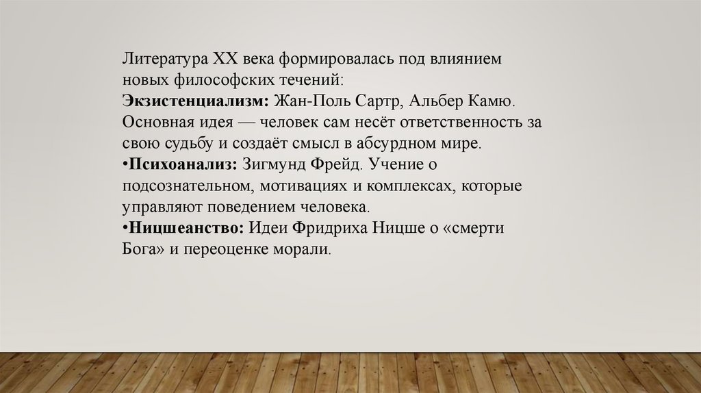 НОВЫЕ ТЕМЫ: ПСИХОЛОГИЗМ И ЭКЗИСТЕНЦИАЛИЗМРАЗВИТИЕ ПСИХОАНАЛИЗА СМЕСТИЛО ФОКУС ЛИТЕРАТУРЫ С ВНЕШНИХ СОБЫТИЙ НА