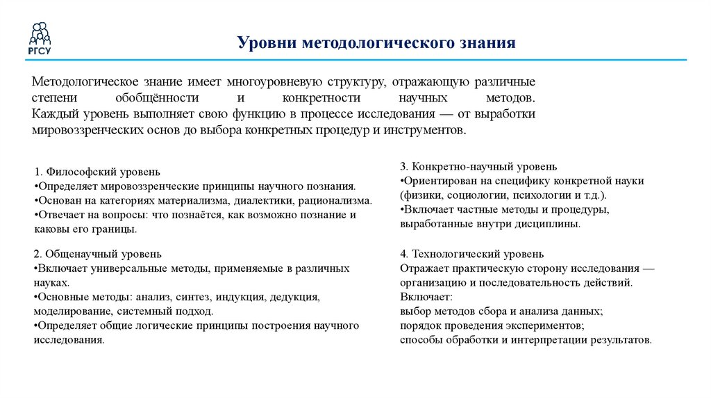 Уровни методологического знанияМетодологическое знание имеет многоуровневую структуру, отражающую различные