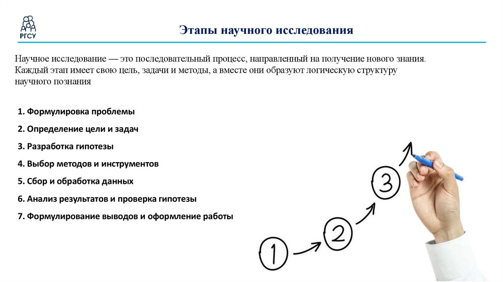 Этапы научного исследованияНаучное исследование — это последовательный процесс, направленный на получение нового знания.