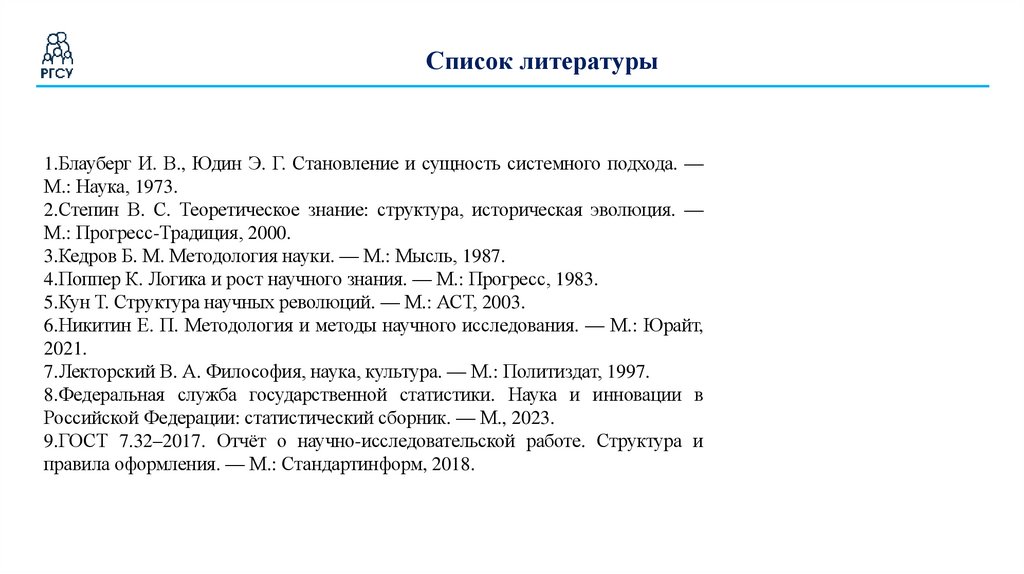 Список литературы1.Блауберг И. В., Юдин Э. Г. Становление и сущность системного подхода. —