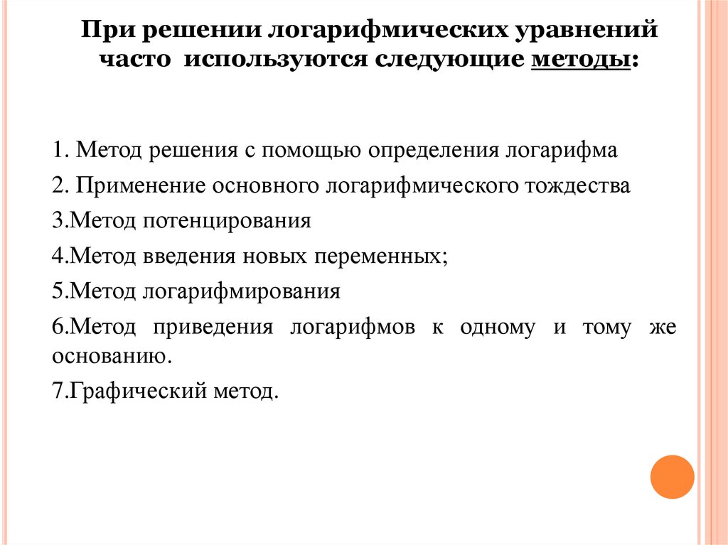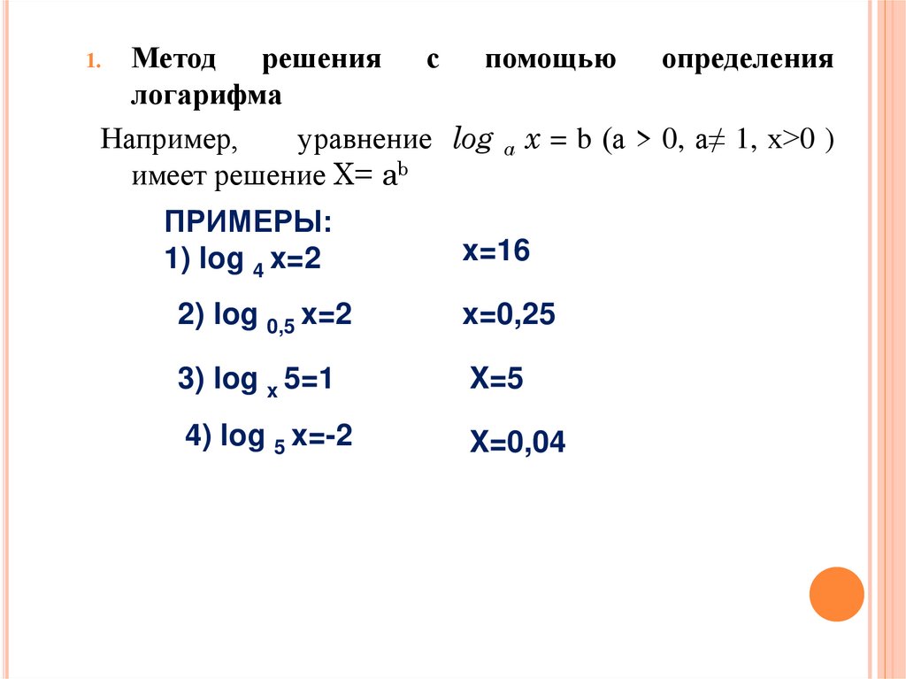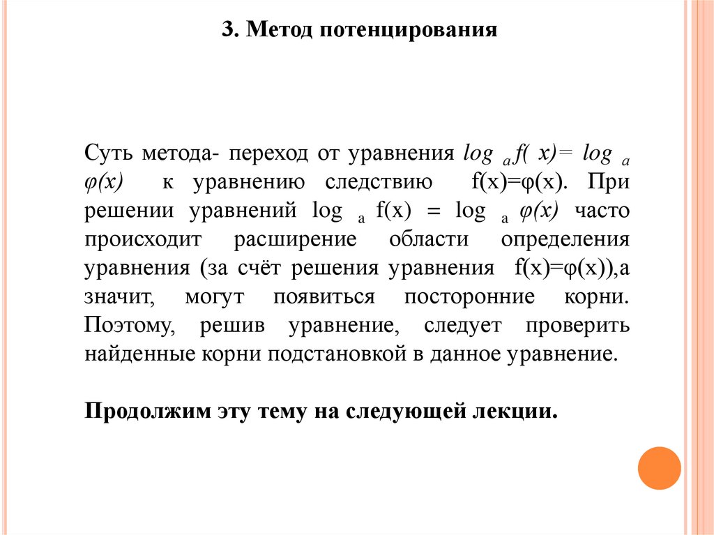 3. Метод потенцированияСуть метода- переход от уравнения log а f( х)= log а