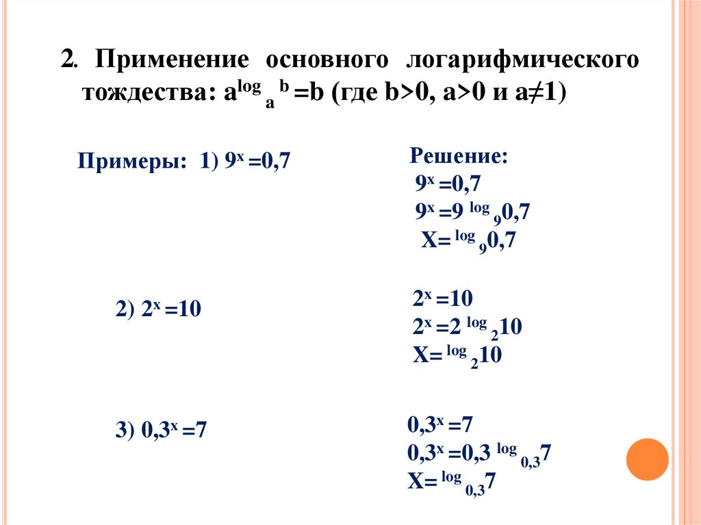 2. Применение основного логарифмическоготождества: alog a b =b (где b>0, a>0 и a≠1)
