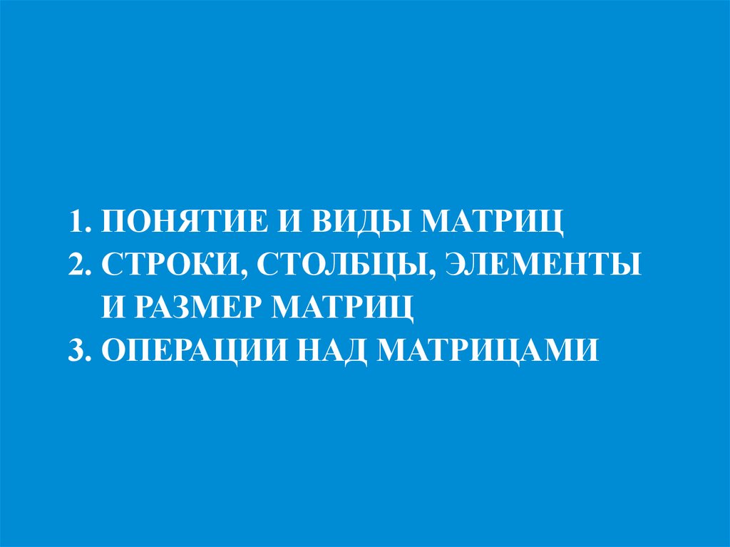 1. ПОНЯТИЕ И ВИДЫ МАТРИЦ2. СТРОКИ, СТОЛБЦЫ, ЭЛЕМЕНТЫ