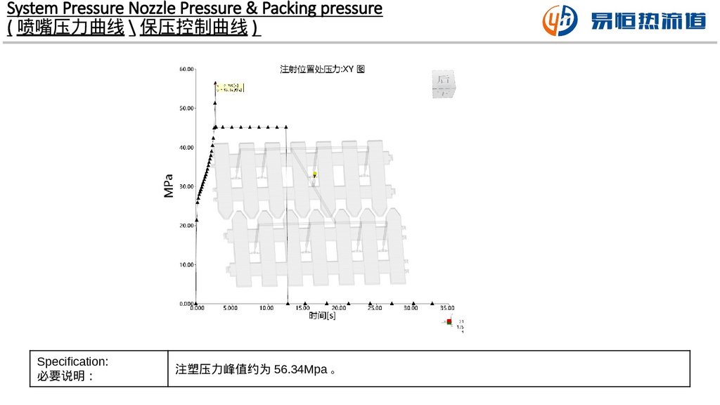 V/P 切换位置约在型腔体积充填达到 98% 时 , 注塑压力峰值约为 56.34Mpa 。