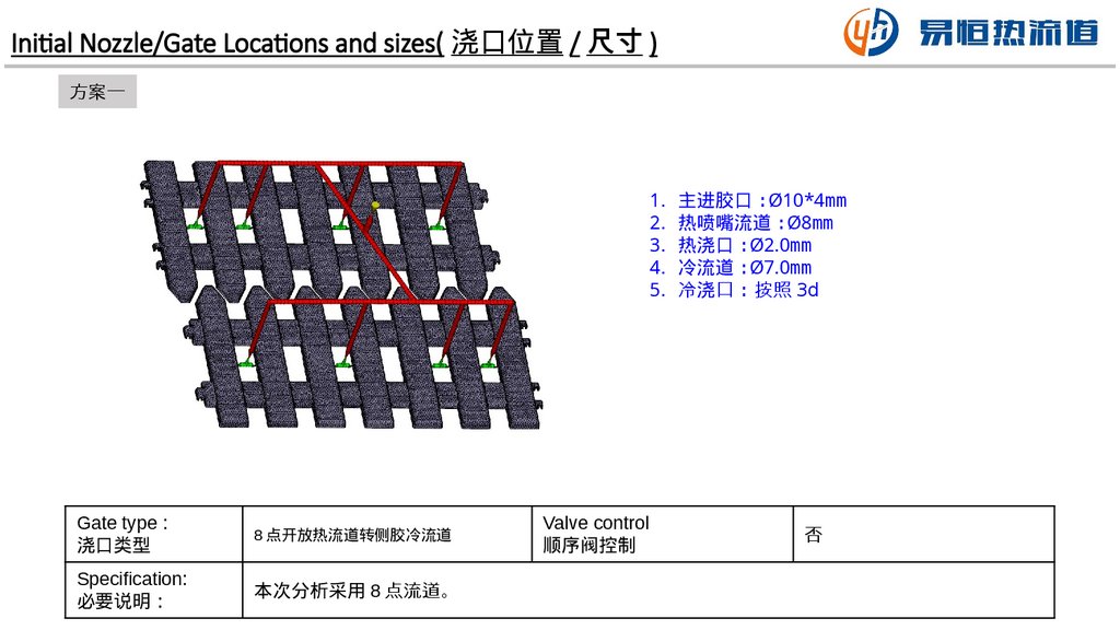 Initial Nozzle/Gate Locations and sizes( 浇口位置 / 尺寸 )方案一