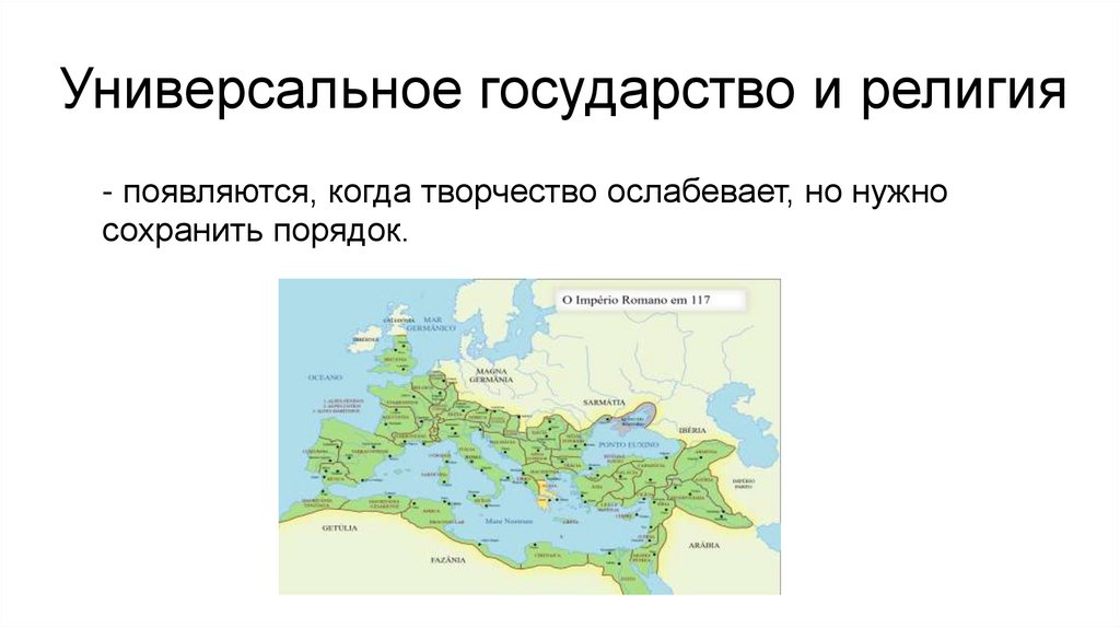 Универсальное государство и религия- появляются, когда творчество ослабевает, но нужно