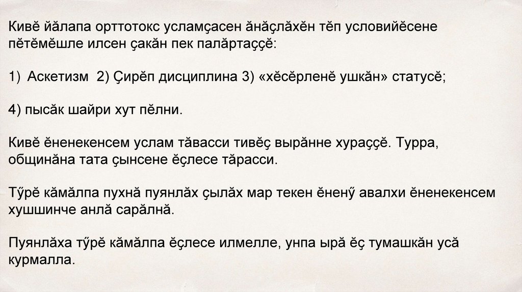 1) Аскетизм 2) Ҫирӗп дисциплина 3) «хӗсӗрленӗ ушкӑн» статусӗ;