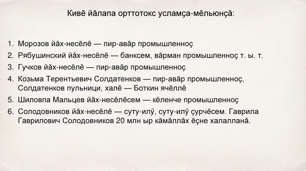 Кивӗ йӑлапа орттотокс усламҫа-мӗльюнҫӑ:1. Морозов йăх-несĕлӗ — пир-авăр промышленноҫ