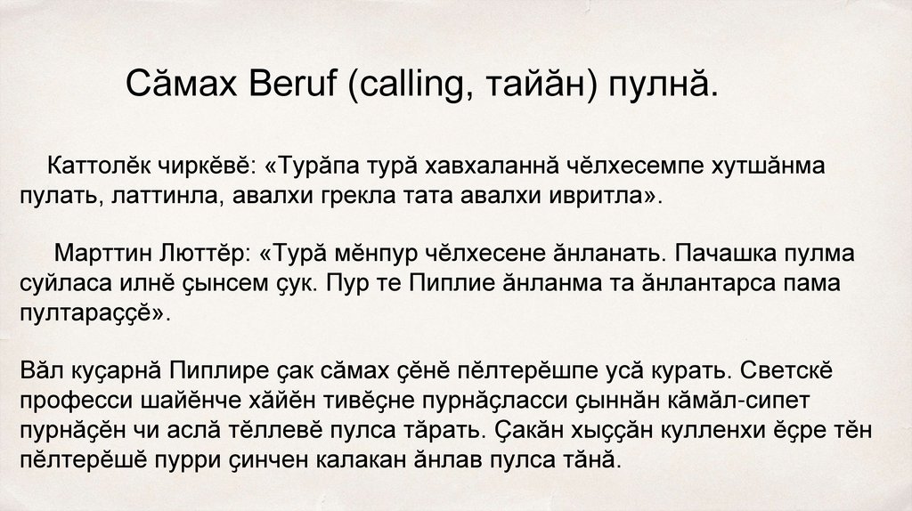 Сӑмах Beruf (calling, тайӑн) пулнӑ.Каттолӗк чиркӗвӗ: «Турӑпа турӑ хавхаланнӑ чӗлхесемпе хутшӑнма