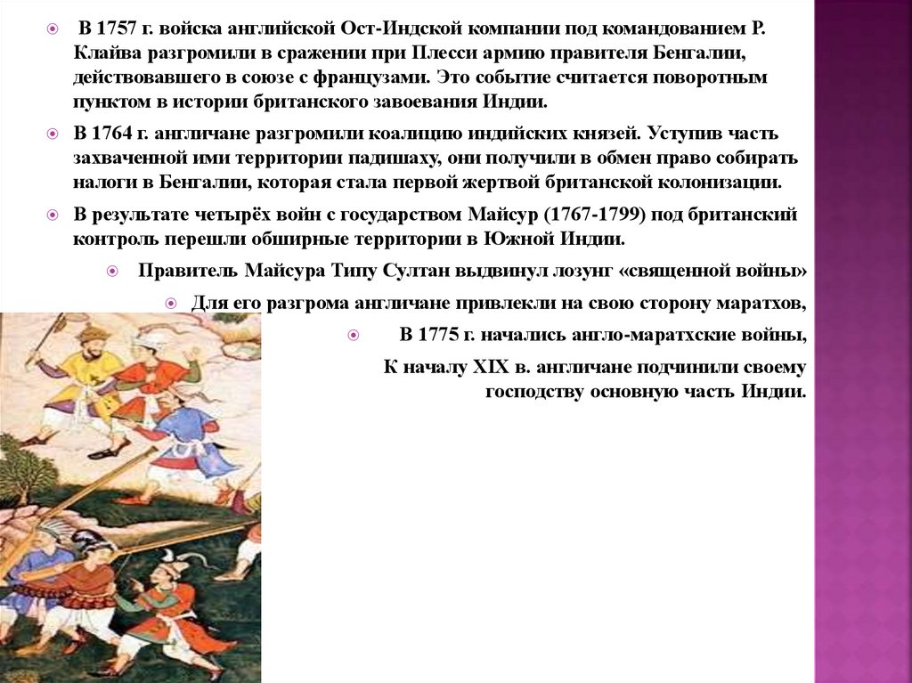 В 1757 г. войска английской Ост-Индской компании под командованием Р.Клайва разгромили в сражении при Плесси армию правителя Бенгалии,