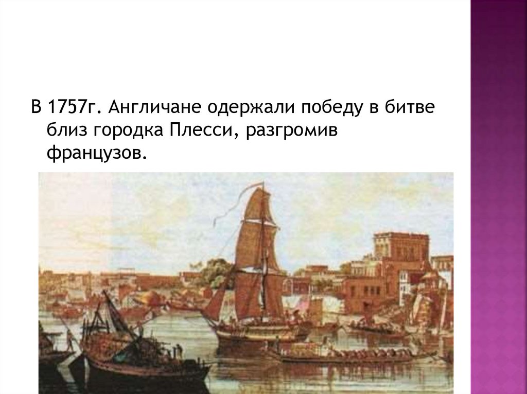 В 1757г. Англичане одержали победу в битвеблиз городка Плесси, разгромив