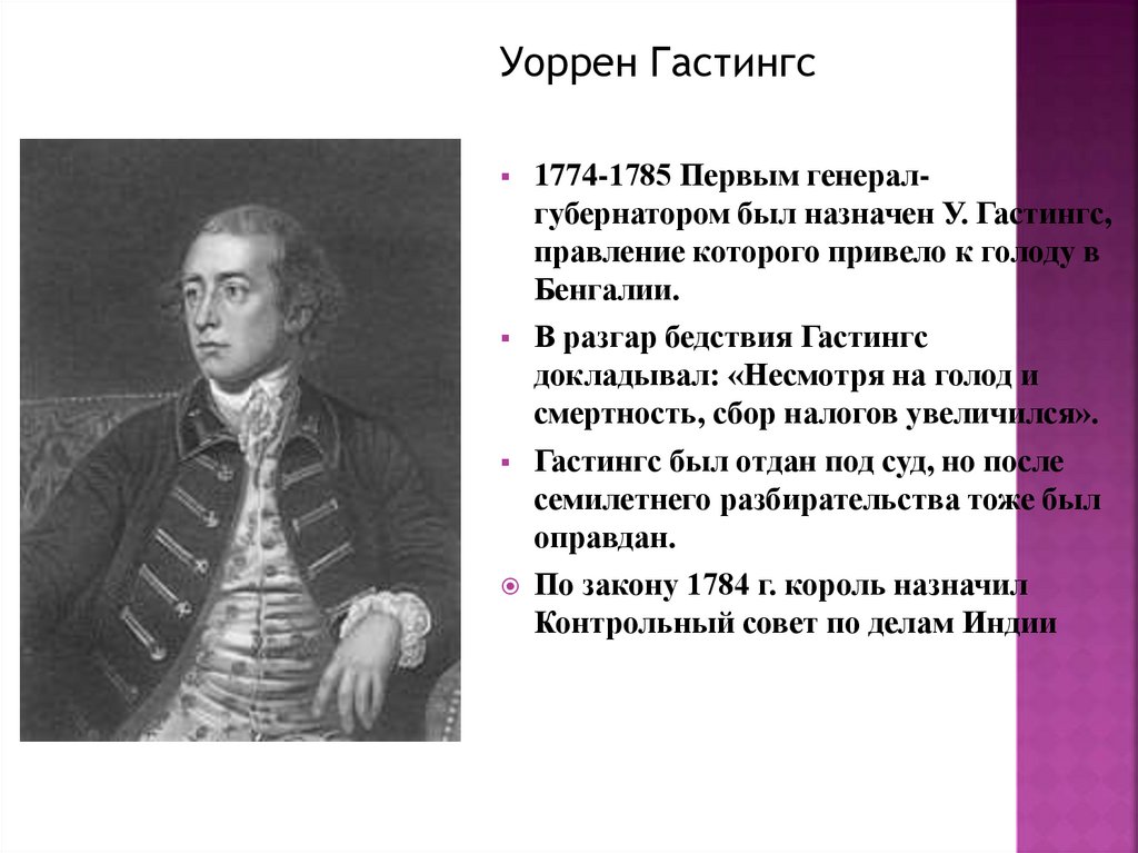 Уоррен Гастингс1774-1785 Первым генералгубернатором был назначен У. Гастингс,