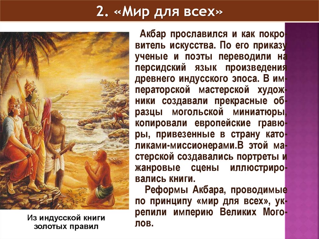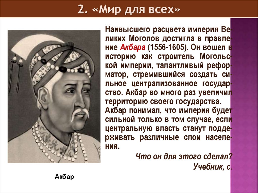2. «Мир для всех»Наивысшего расцвета империя Великих Моголов достигла в правление Акбара (1556-1605). Он вошел в