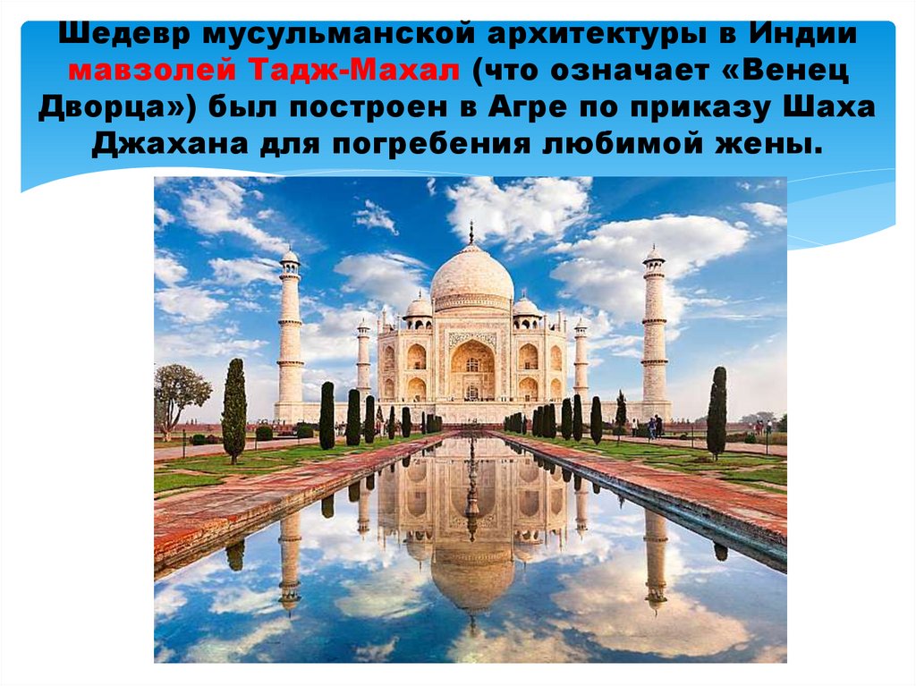 Шедевр мусульманской архитектуры в Индиимавзолей Тадж-Махал (что означает «Венец