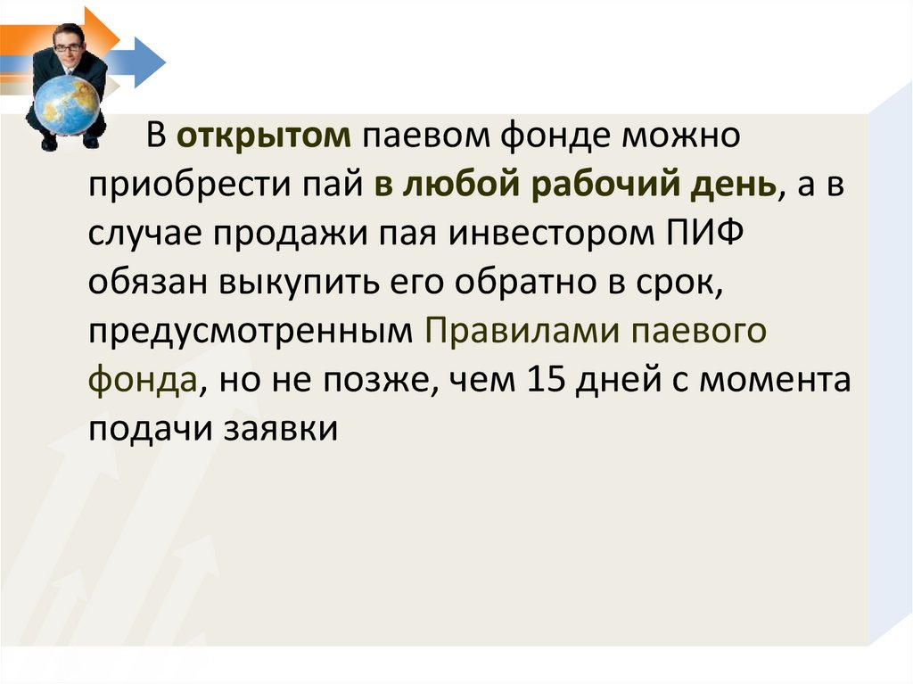 В открытом паевом фонде можноприобрести пай в любой рабочий день, а в