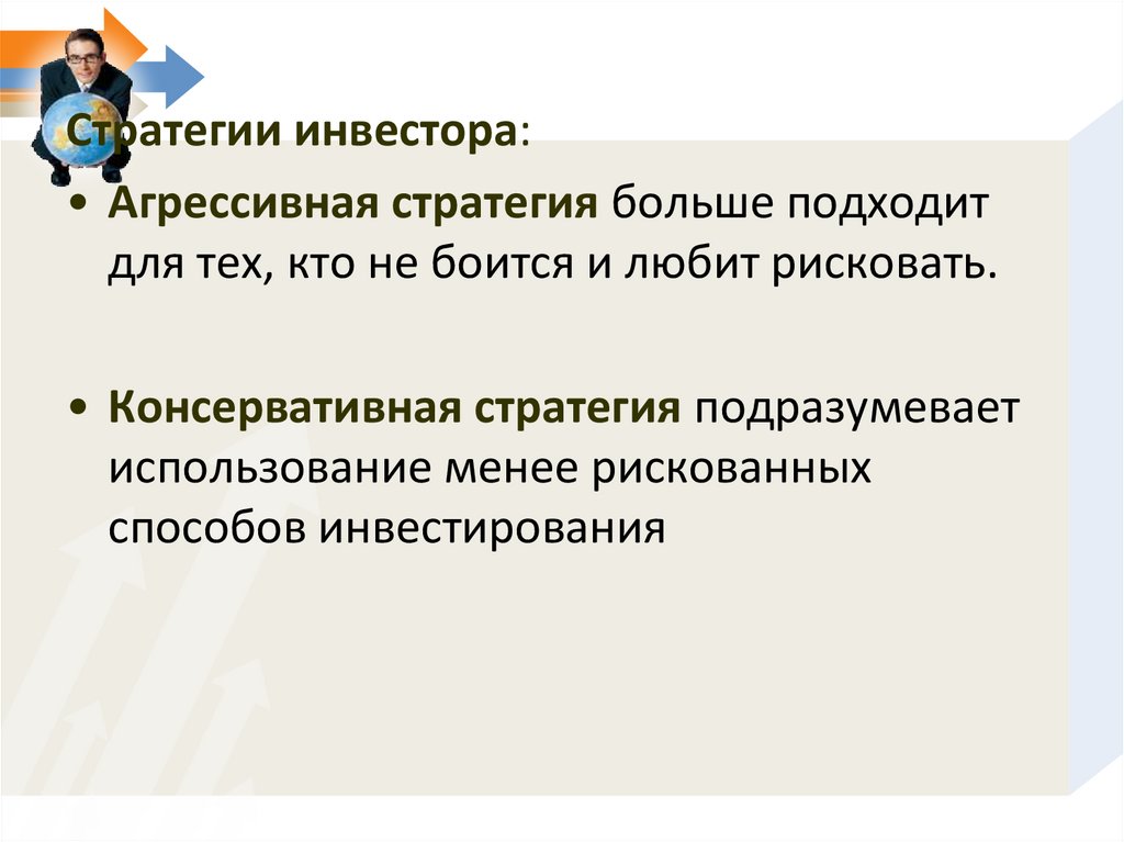 Стратегии инвестора:• Агрессивная стратегия больше подходит