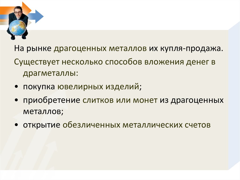 На рынке драгоценных металлов их купля-продажа.Существует несколько способов вложения денег в