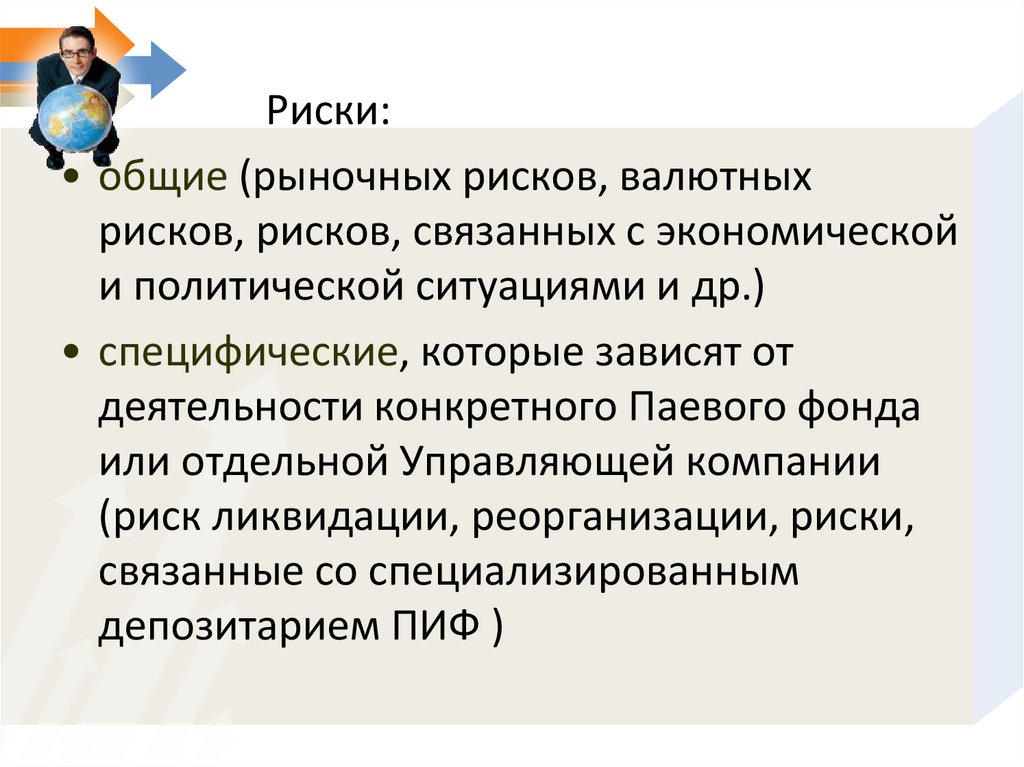 Риски:• общие (рыночных рисков, валютных