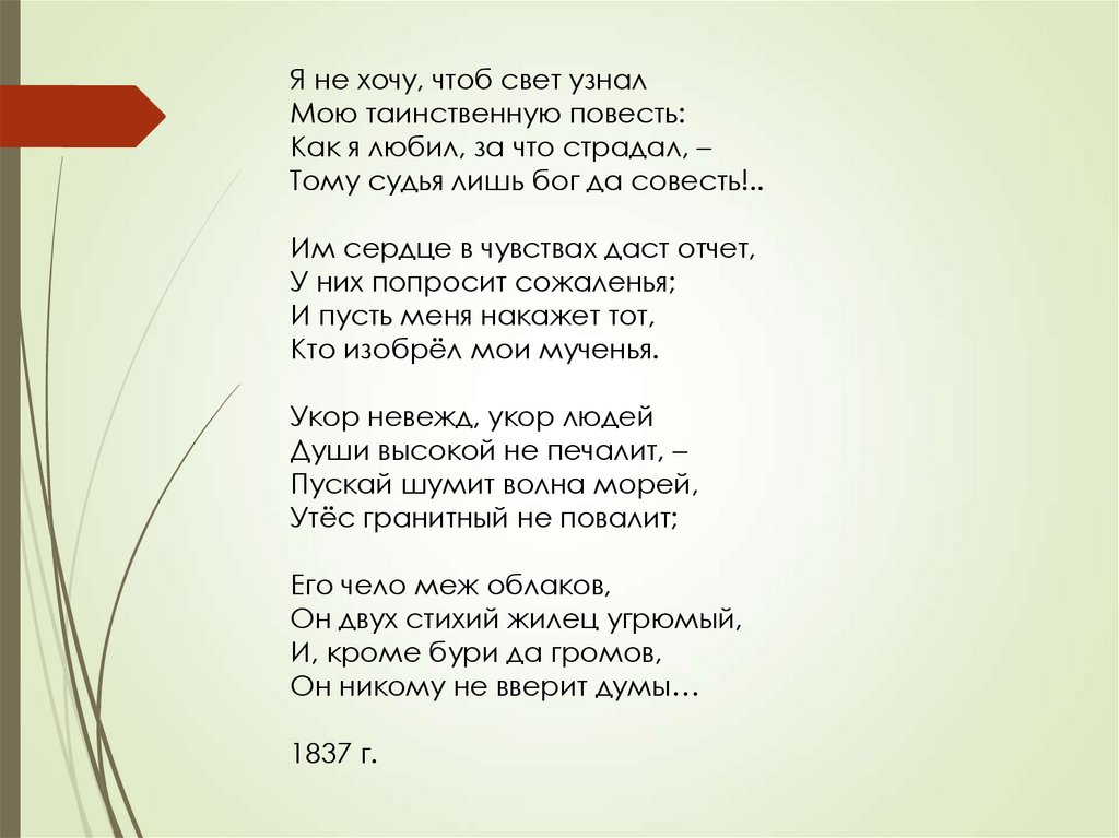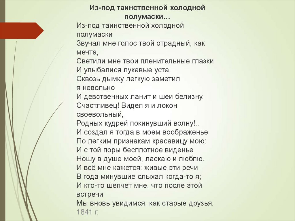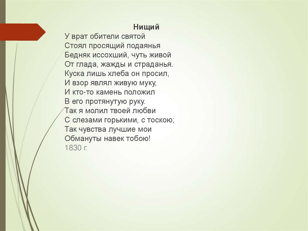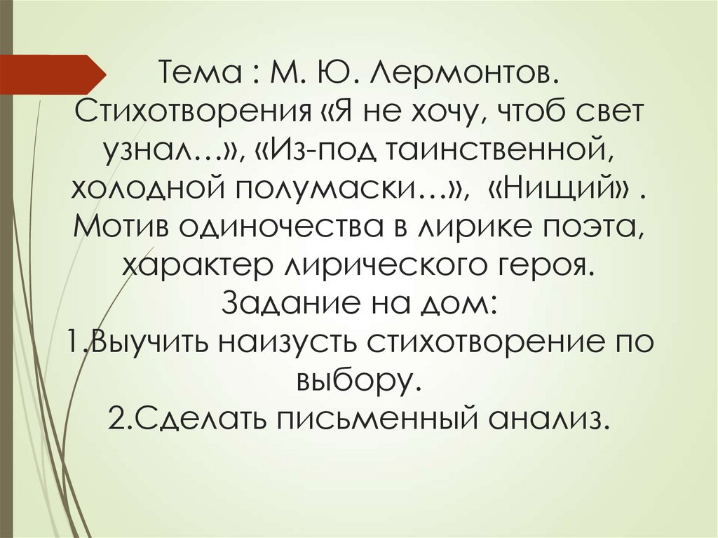 1. Тема : М. Ю. Лермонтов. Стихотворения «Я не хочу, чтоб свет узнал…», «Из-под таинственной, холодной полумаски…», «Нищий» .