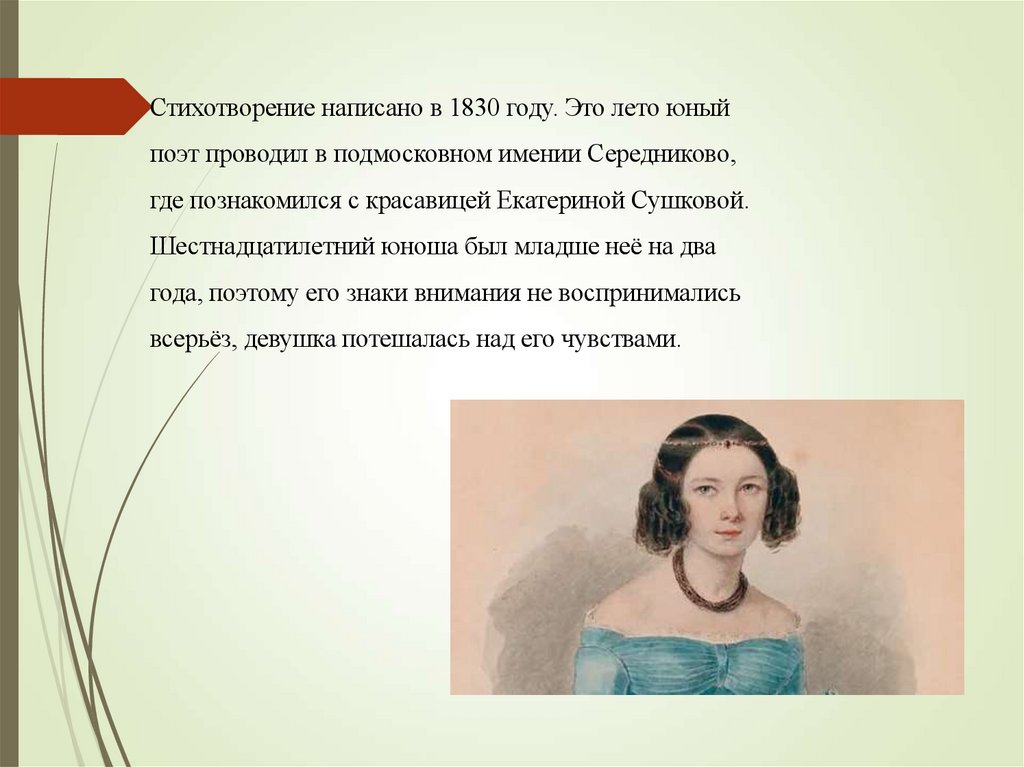 Стихотворение написано в 1830 году. Это лето юныйпоэт проводил в подмосковном имении Середниково,