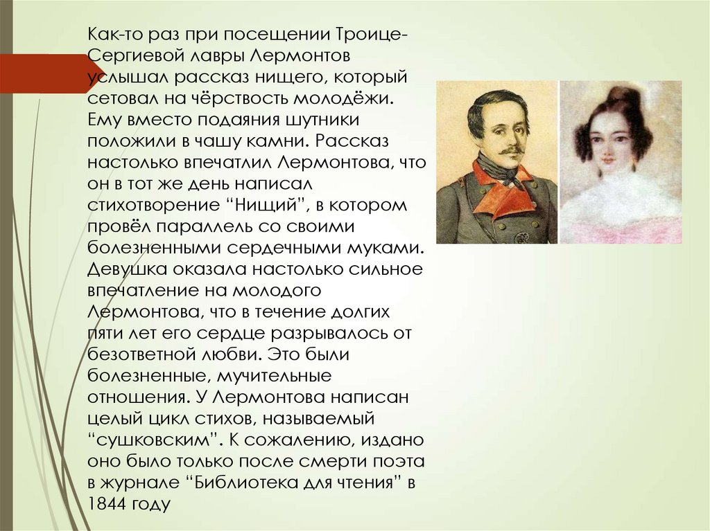 Как-то раз при посещении ТроицеСергиевой лавры Лермонтовуслышал рассказ нищего, который