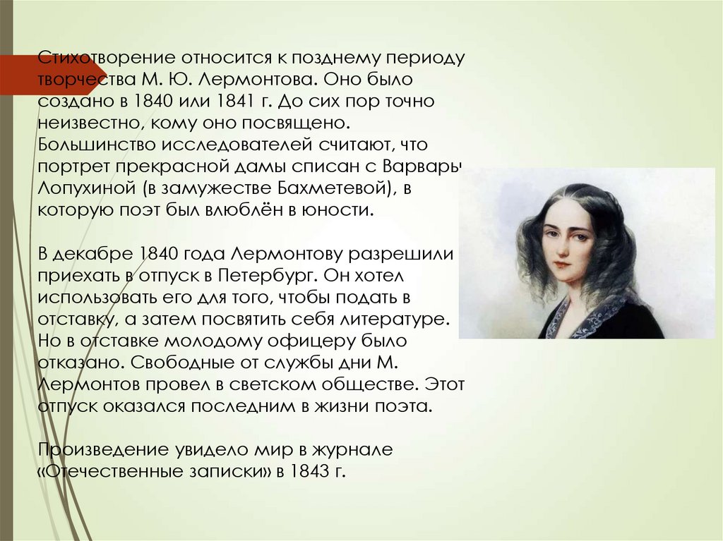 Стихотворение относится к позднему периодутворчества М. Ю. Лермонтова. Оно было