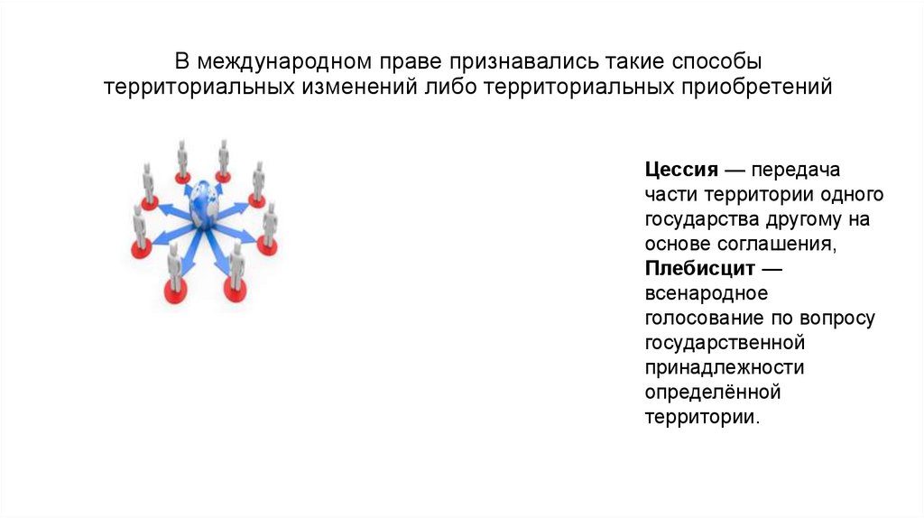 В международном праве признавались такие способытерриториальных изменений либо территориальных приобретений