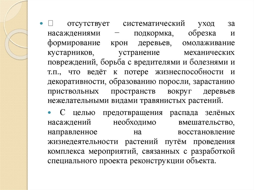 Реконструкция и восстановление зелёных насаждений наобъектах озеленения осуществляются на основании специального