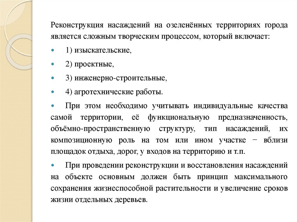 Реконструкция насаждений на озеленённых территориях городаявляется сложным творческим процессом, который включает: