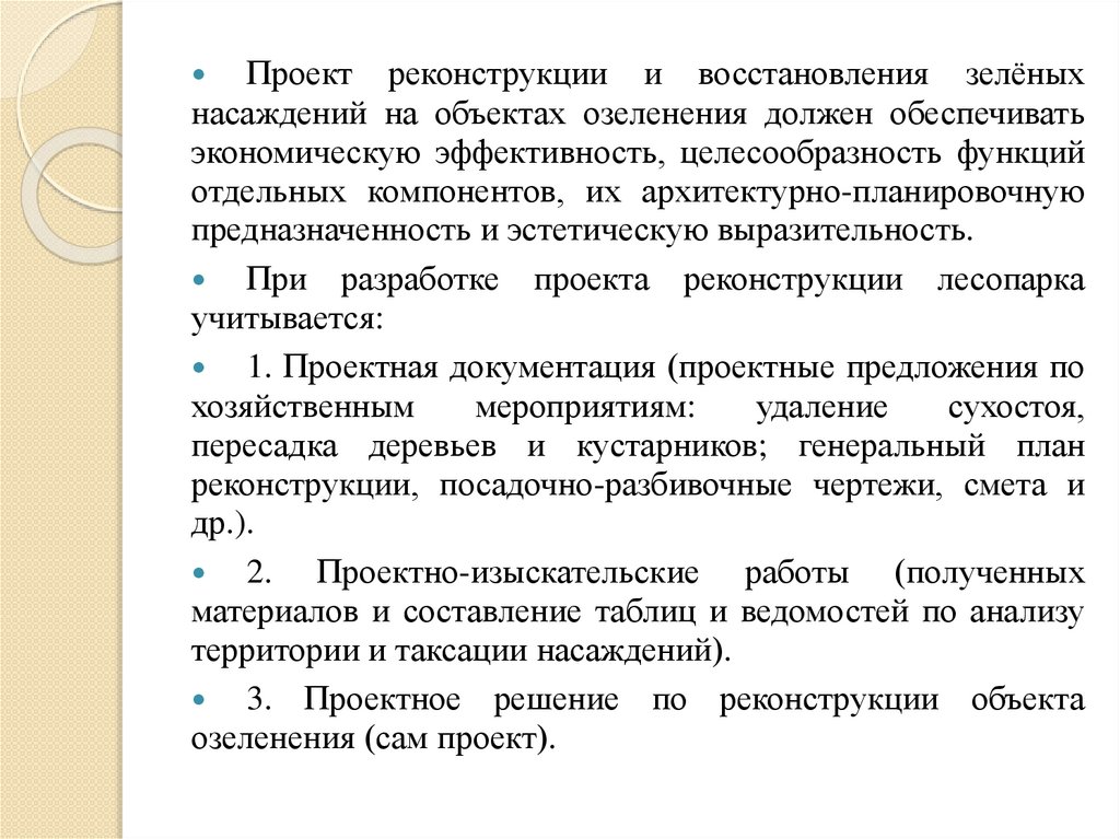 Проект реконструкции и восстановления зелёныхнасаждений на объектах озеленения должен обеспечивать