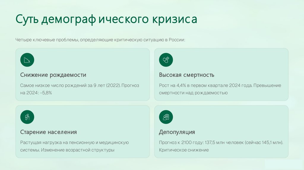 Суть демограф ического кризис аЧетыре ключевые проблемы, определяющие критическую ситуацию в России: