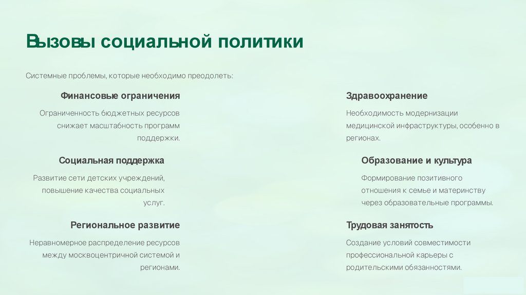 Вызовы социальной политикиСистемные проблемы, которые необходимо преодолеть: