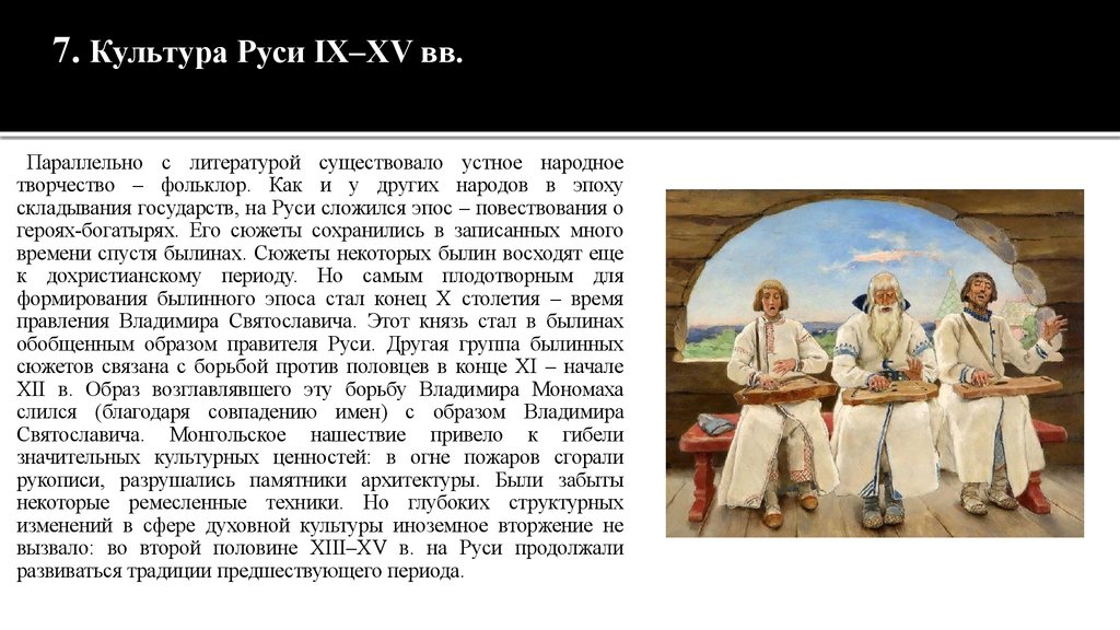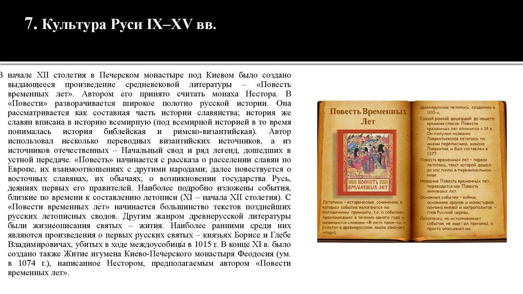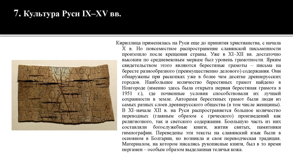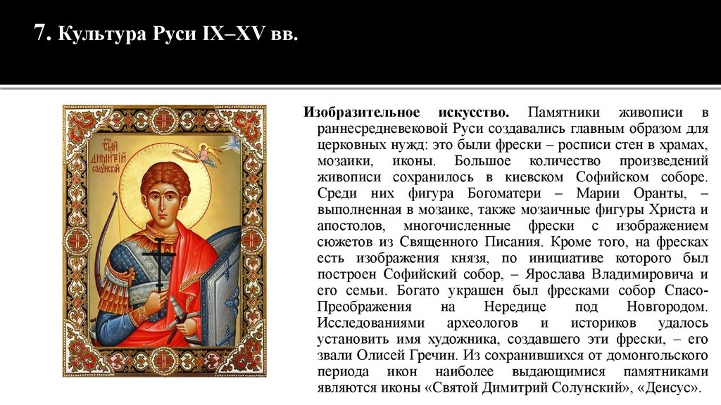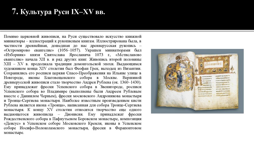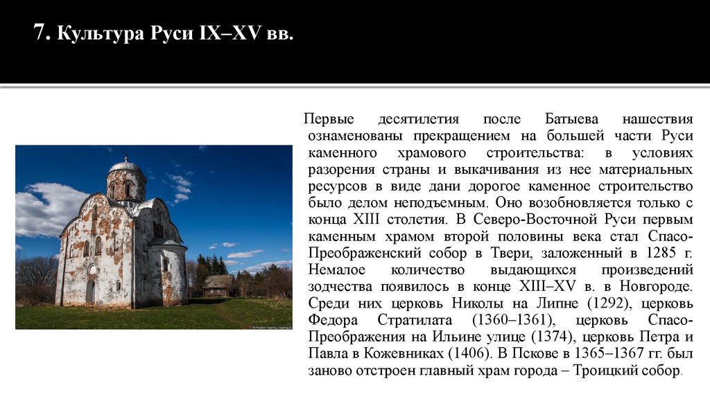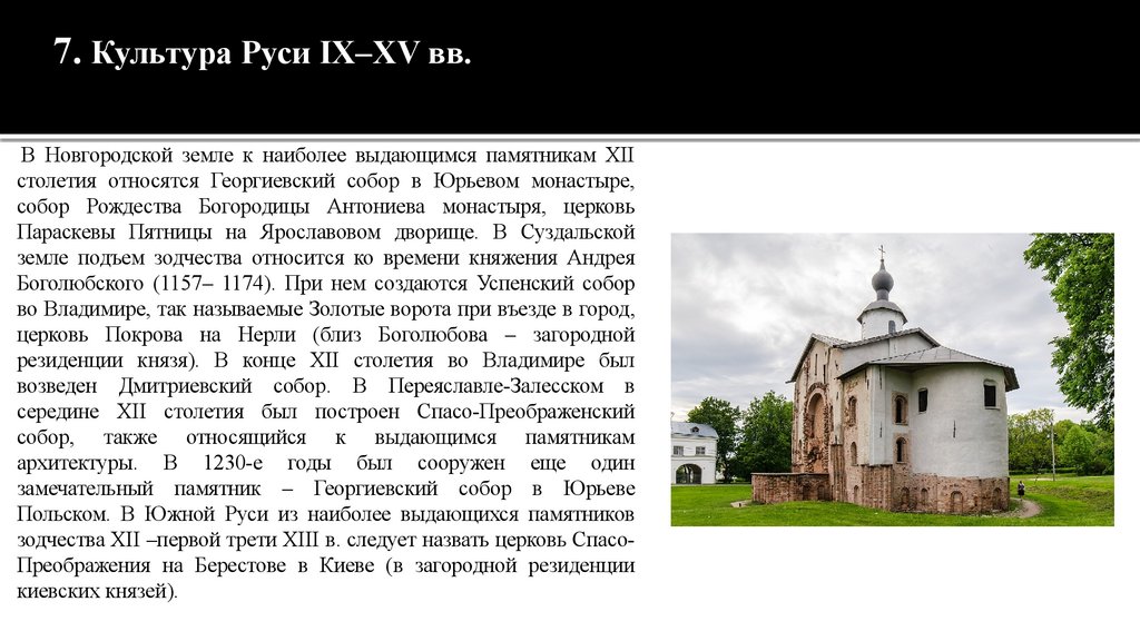 7. Культура Руси IX–XV вв.В Новгородской земле к наиболее выдающимся памятникам XII