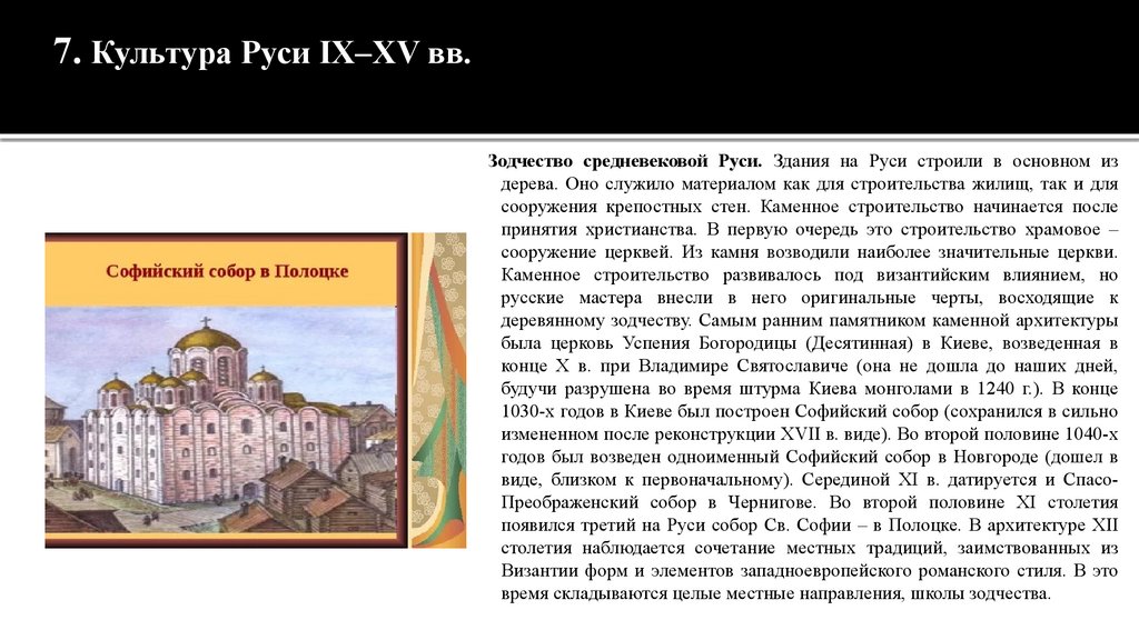 7. Культура Руси IX–XV вв.Зодчество средневековой Руси. Здания на Руси строили в основном из