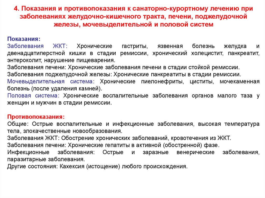 4. Показания и противопоказания к санаторно-курортному лечению призаболеваниях желудочно-кишечного тракта, печени, поджелудочной
