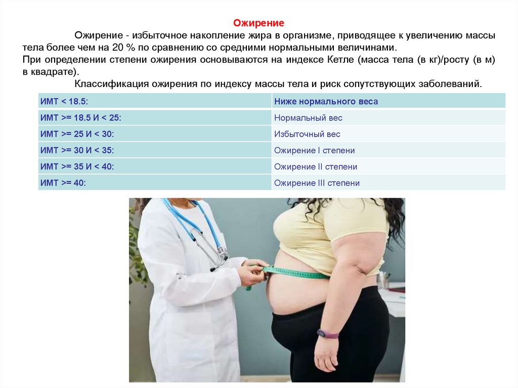 Классификация ожирения по индексу массы тела и риск сопутствующих заболеваний.