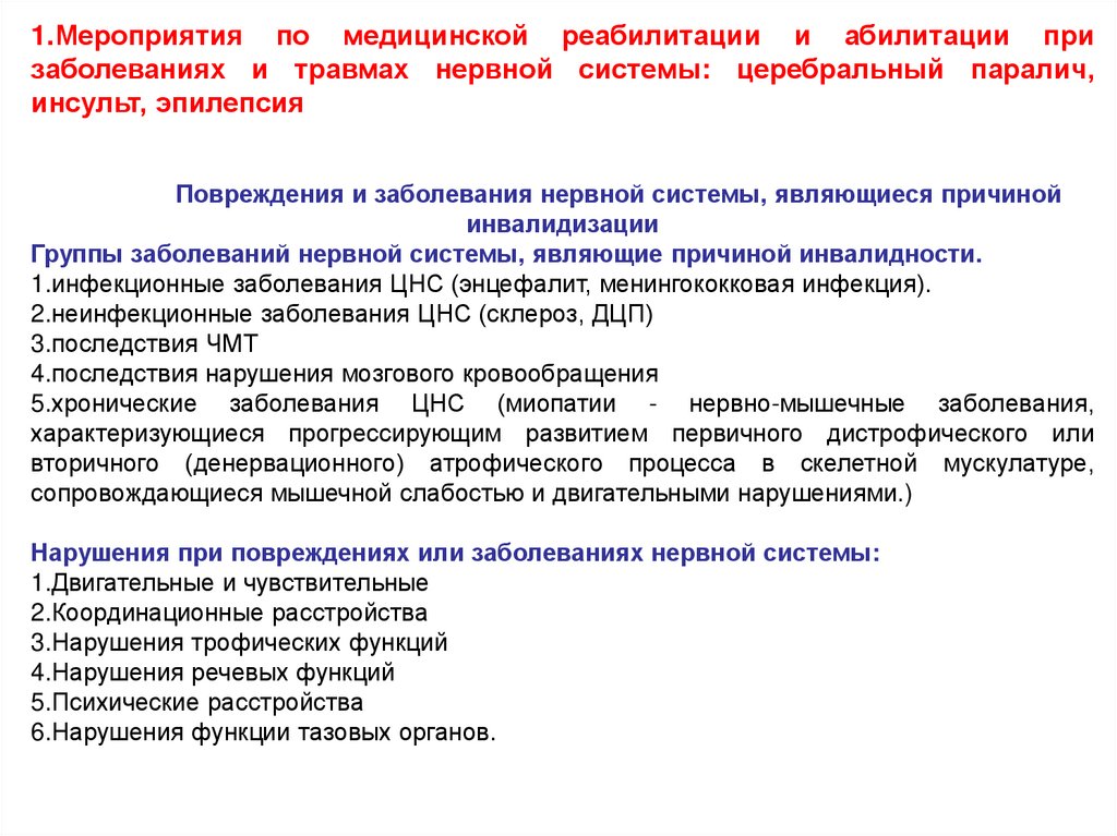 1.Мероприятия по медицинской реабилитации и абилитации призаболеваниях и травмах нервной системы: церебральный паралич,
