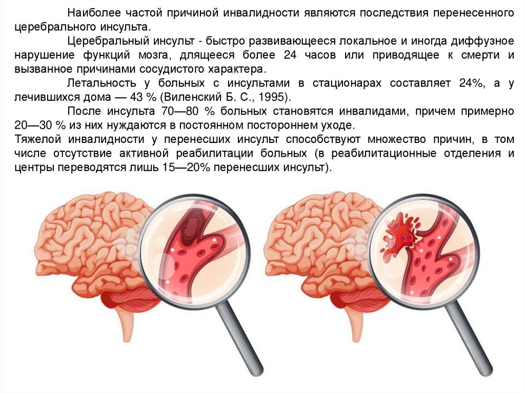 После инсульта 70—80 % больных становятся инвалидами, причем примерно