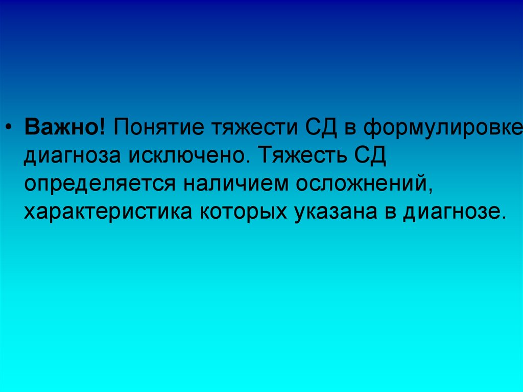 • Важно! Понятие тяжести СД в формулировкедиагноза исключено. Тяжесть СД