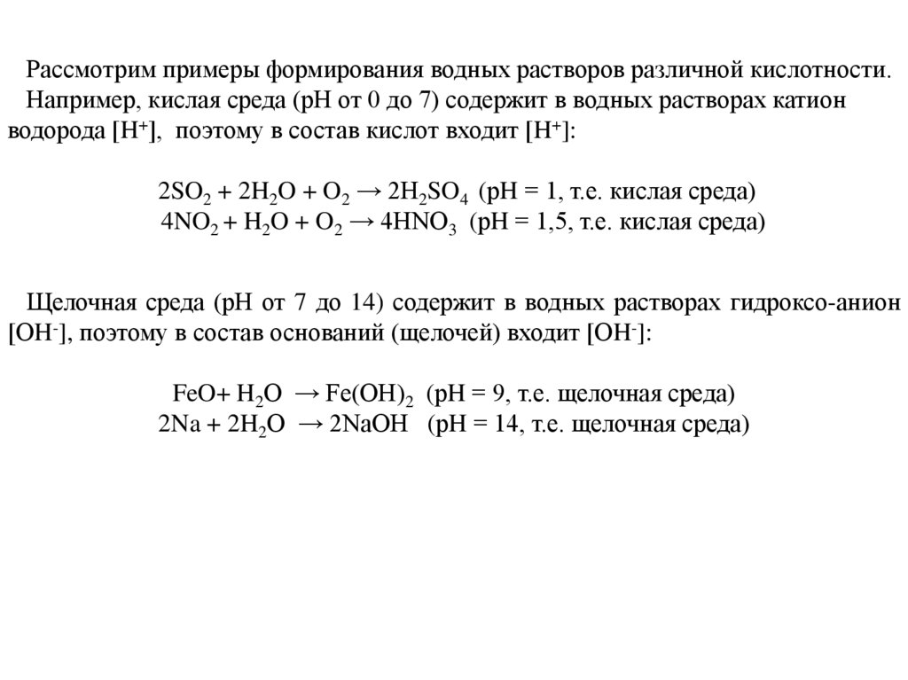 Рассмотрим примеры формирования водных растворов различной кислотности.Например, кислая среда (рН от 0 до 7) содержит в водных растворах катион