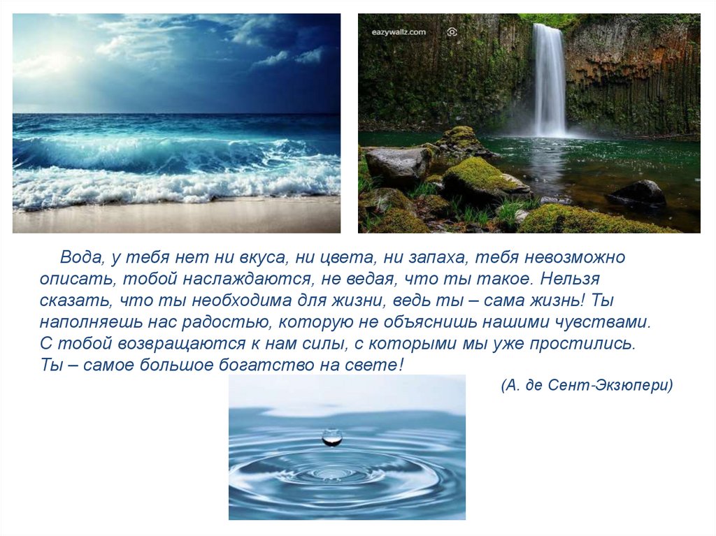 Вода, у тебя нет ни вкуса, ни цвета, ни запаха, тебя невозможноописать, тобой наслаждаются, не ведая, что ты такое. Нельзя