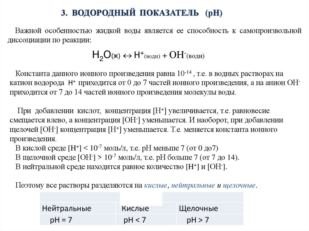 3. ВОДОРОДНЫЙ ПОКАЗАТЕЛЬ (рН)Важной особенностью жидкой воды является ее способность к самопроизвольной
