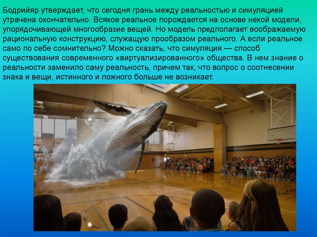 Бодрийяр утверждает, что сегодня грань между реальностью и симуляциейутрачена окончательно. Всякое реальное порождается на основе некой модели,