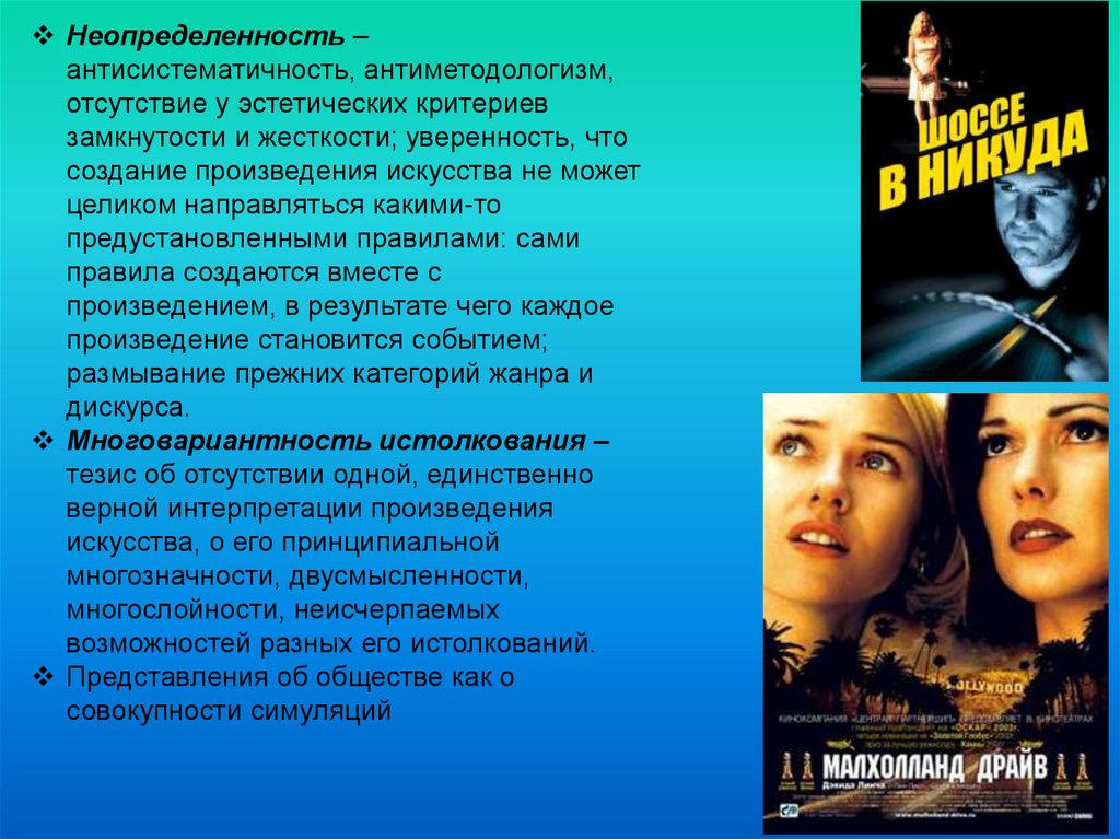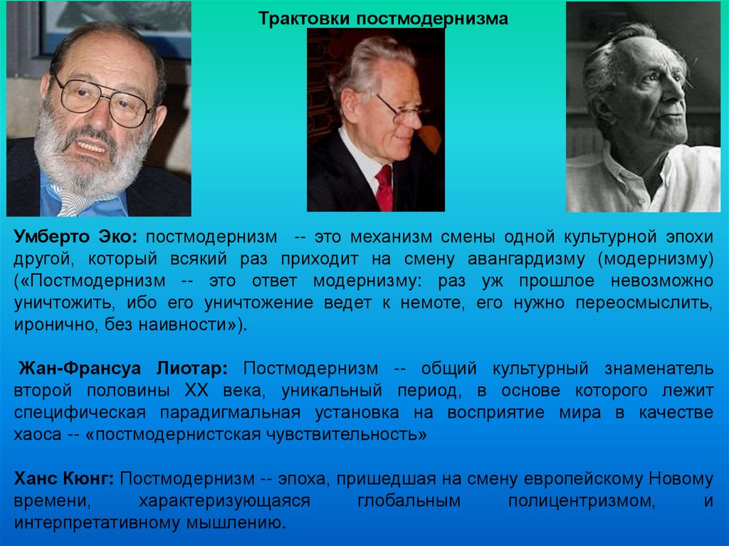 Трактовки постмодернизмаУмберто Эко: постмодернизм -- это механизм смены одной культурной эпохи