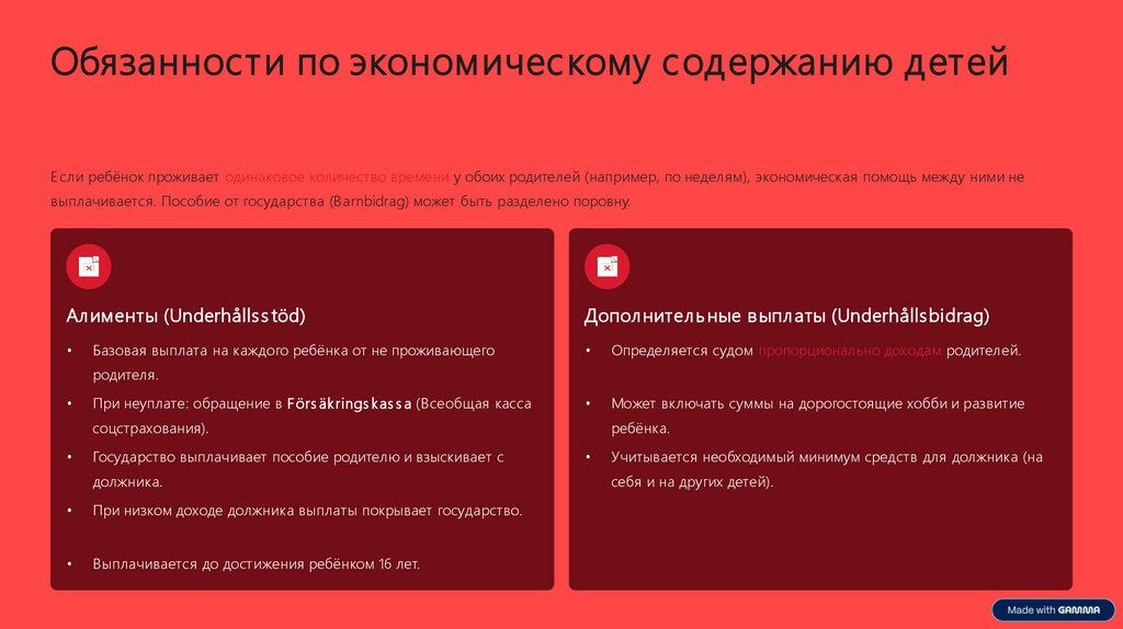 Обязанности по экономическому содержанию детейЕ сли ребёнок проживает одинаковое количество времени у обоих родителей (например, по неделям), экономическая помощь между ними не