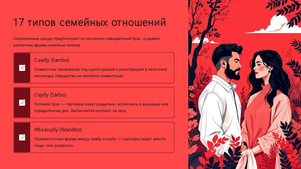 1 7 типов семейных отношенийСовременные шведы предпочитают не заключать официальный брак, создавая