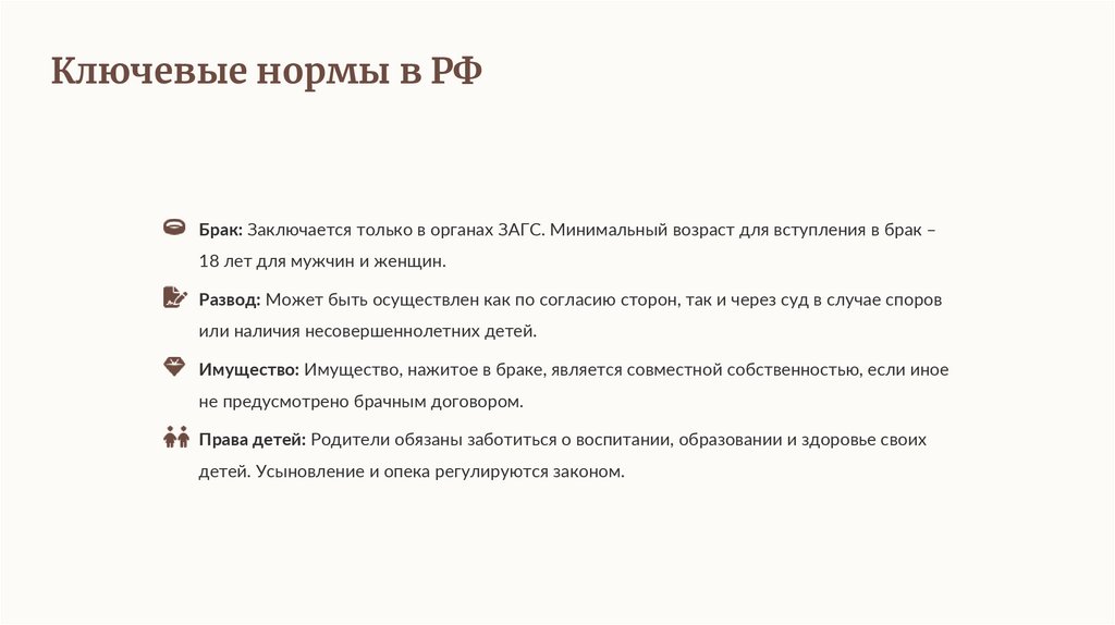 Ключевые нормы в РФБрак: Заключается только в органах ЗАГС. Минимальный возраст для вступления в брак –