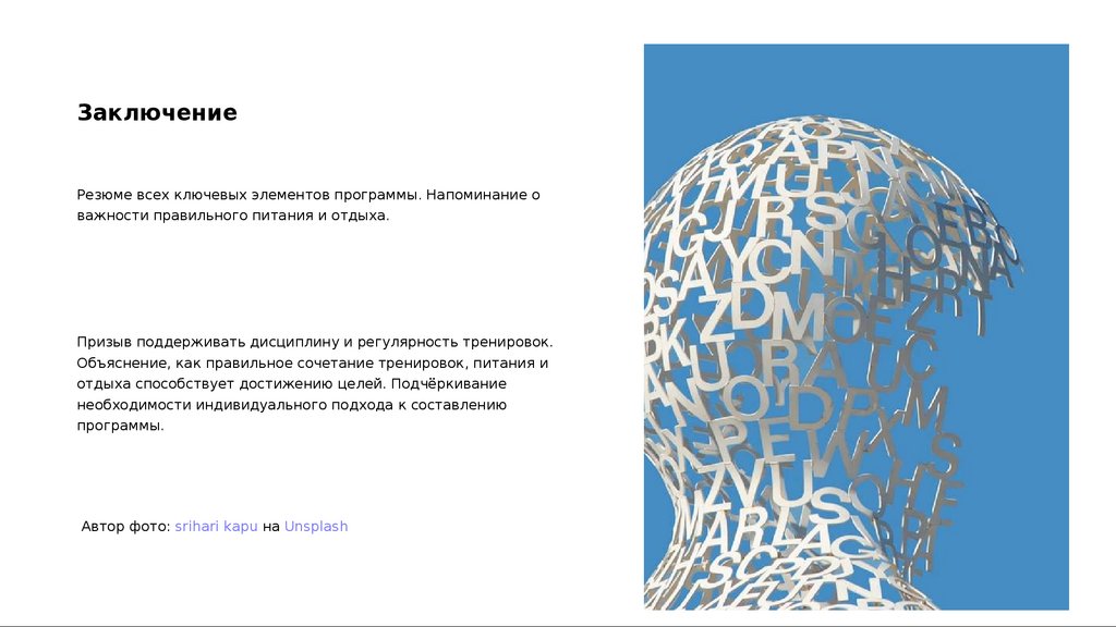 ЗаключениеРезюме всех ключевых элементов программы. Напоминание о