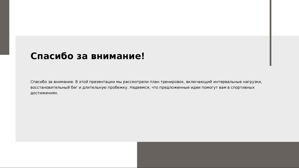 Спасибо за внимание!Спасибо за внимание. В этой презентации мы рассмотрели план тренировок, включающий интервальные нагрузки,